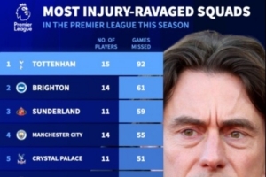 体育资讯11月25日讯 德转列本赛季英超球队伤病榜,热刺15人次受伤,共计缺席92场比赛排名第一,布莱顿、桑德兰位列二三位。
