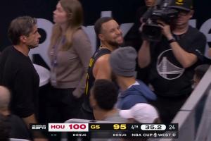 GIF-库里暂停时坐不住 坐下突然弹起