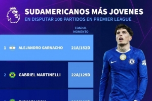 体育资讯12月2日讯 德国转会市场统计了南美球员出战100场英超比赛的年龄,并列出最年轻球员排名,加纳乔居首。
