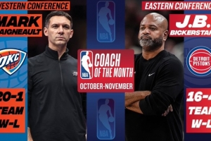 体育资讯12月3日讯 今日NBA官方公布了10-11月东西部月最佳主帅,雷霆主帅戴格诺特与活塞主帅比克斯塔夫当选。