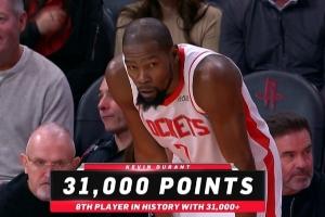 杜兰特得到本场第4分,个人生涯得分突破31000分大关,成为NBA历史上第8位得分破31000的球员!