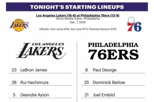 体育资讯12月8日讯 今日8点半,76人主场对阵湖人。赛前双方公布了本场首发阵容: