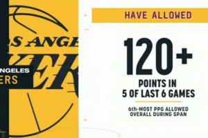 备注:湖人近6场失分为联盟第6多