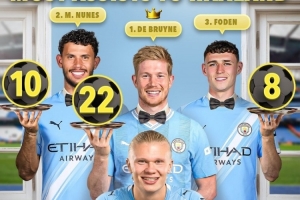 体育资讯12月15日讯 哈兰德加盟曼城以来攻入147粒进球,Score90统计了球员在曼城助攻哈兰德的次数,并列出前三名榜单,德布劳内22助居首。