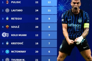 1.普利西奇(米兰) 22场进12球