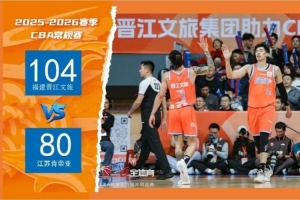 今晚CBA常规赛第二轮继续开战,福建晋江文旅男篮坐镇主场晋江祖昌体育馆,以104-80的比分酣畅淋漓地击败江苏肯帝亚男篮,顺利斩获新赛季首胜。整场比赛主队凭借流畅的攻防转换与全员发力的团队表现,将比赛节奏牢牢掌控在手中,用四节阶梯式的攻势终结悬念,为现场球迷奉献了一场极具观赏性的胜利。四节比分分别是:23-23,36-22,25-16,20-19(福建晋江文旅男篮在前)。