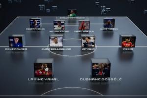 多萨里(利雅得新月)、巴尔科拉(巴黎圣日耳曼)、登贝莱(巴黎圣日耳曼)、杜埃(巴黎圣日耳曼)、吉拉西(多特蒙德)、约克雷斯(葡萄牙体育/阿森纳)、哈兰德(曼城)、路易斯·恩里克(博塔弗戈/圣彼得堡泽尼特)、伊萨克(纽卡斯尔联/利物浦)、凯恩(拜仁)、克瓦拉茨赫利亚(那不勒斯/巴黎圣日耳曼)、莱万多夫斯基(巴塞罗那)、劳塔罗(国际米兰)、姆巴佩(皇家马德里)、梅西(迈阿密国际)、若昂·佩德罗(布莱顿/切尔西)、拉菲尼亚(巴塞罗那)、雷特吉(亚特兰大/卡迪西亚)、C罗(利雅得胜利)、萨拉赫(利物浦)、维尼修斯(皇家马德里)、亚马尔(巴塞罗那)
