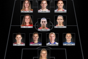 后卫:布隆泽(英格兰/切尔西)、莉娅·威廉姆森(英格兰/阿森纳)、伊雷内·帕雷德斯(西班牙/巴萨)、奥娜·巴特勒(西班牙/巴萨)