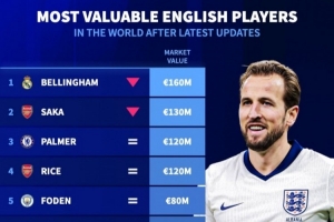 英格兰球员最新身价榜:欧元