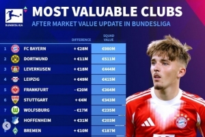 体育资讯12月19日讯 《转会市场》在今日更新了德甲球员身价,也统计了德甲各队的最新身价情况。