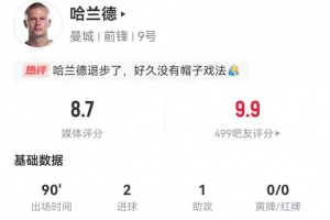 体育资讯12月21日讯 曼城在本轮英超对阵西汉姆联,哈兰德本场数据如下: