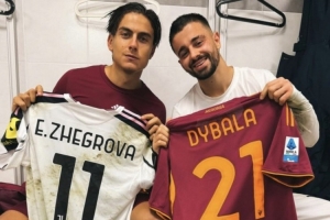 赛后迪巴拉还和尤文球员热格罗瓦交换了球衣,两人在更衣室内合影留念。