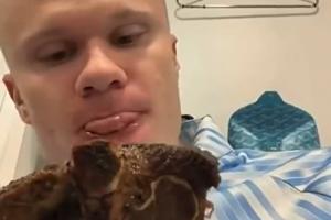哈兰德在社交媒体上晒出了一段视频,视频中,他坐在更衣室里,手拿着一块带骨牛排对着镜头一顿猛啃,边吃还舔嘴,看得出他吃得很香。
