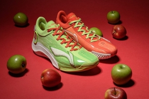 球鞋采用鸳鸯配色,鞋面还带有类似苹果的纹理,而在鞋后跟处,分别写着拼音拼写的杨瀚森姓名还有“young handsome”。
