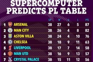 根据超级计算机的预测,阿森纳将以87分夺得英超冠军,曼城82分第二,阿斯顿维拉、切尔西进入前四,利物浦、曼联分列第五、第六,狼队将以10分创造英超历史最低分纪录。