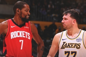 赛后火箭官推发布赢球海报,杜兰特和东契奇对视瞬间成为封面。