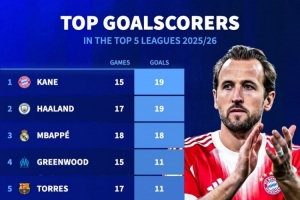 体育资讯12月27日讯 德国转会市场列出了本赛季五大联赛射手榜,凯恩、哈兰德19球居首。