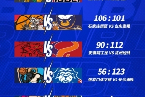 NBL常规赛第三轮今日战罢,石家庄翔蓝106-101险胜山东蜜獾,安徽皖江龙90-112不敌杭州经纬,张家口体文旅56-123不敌长沙勇胜。