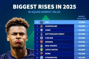 体育资讯12月28日讯 德转已经更新了各大联赛球员身价,并据此统计了在2025年的俱乐部身价涨幅情况,新科欧冠冠军巴黎领跑。