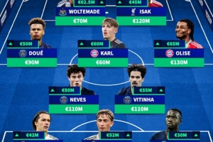中场:杜埃(巴黎,+5000万,9000万)、卡尔(拜仁,+6000万,6000万)、奥利塞(拜仁,+6500万,1.3亿)、若昂·内维斯(巴黎,+5000万,1.1亿)、维蒂尼亚(巴黎,+5500万,1.1亿)