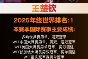 体育资讯12月30日讯 WTT盘点了王楚钦2025年的具体表现,他以年终世界排名第一的成绩收官。