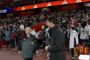 赛后,枪手主帅阿尔特塔先是和助教击掌相庆,但随后他环顾对面一圈却没看到维拉主帅埃梅里来握手,只好跳过这个环节进场恭喜自家球员。