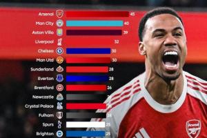 优势较大3队:阿森纳45分、曼城40分、维拉39分