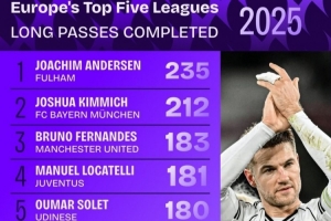 体育资讯1月1日讯 2025年已经结束,数据机构squawka也统计了2025年成功长传情况,富勒姆的后卫安诺森领跑。
