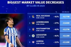 体育资讯1月2日讯 2025年已经结束,《转会市场》也统计了年度球队身价贬值榜,皇社、药厂分列前二。