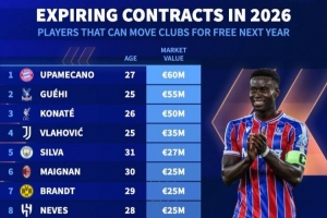 体育资讯1月2日讯 2026年已经到来,多位知名球员将在今夏合同到期,《转会市场》也统计了今夏合同到期球员的最贵身价榜,三大中卫包揽前三。