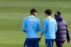 Víctor Navarro在社交媒体上传了弗里克和这两名球员一起走上训练场的视频,并配文写道:“在德比战前的最后一次训练中,弗里克、库巴西和伯纳尔踏上训练场。”