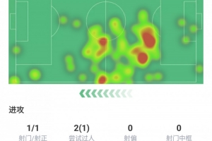 射门1次、射正1次、尝试过人2次成功1次、丢失球权15次