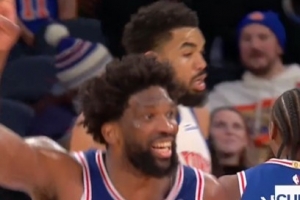GIF-恩比德赛季首扣后双手指天庆祝