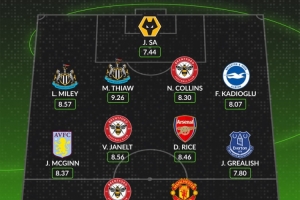体育资讯1月5日讯 WhoScored列出了英超第20轮最佳阵容,库尼亚、赖斯、格拉利什在列。