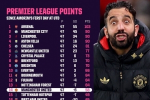 阿莫林执教曼联以来英超积分排名: