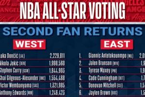 体育资讯1月7日讯 2026年NBA全明星球迷投票首轮结果出炉,东契奇领跑全联盟(票王),字母哥东部第1,约基奇、布伦森和马克西分列得票总排名前5,库里西部第3,詹姆斯升至西部第8。