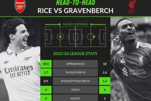 赖斯(阿森纳):18首发、1替补,场均1.7抢断、0.9拦截、1.7关键传球,传球成功率89.5%,4球、3助攻,场均7.33分