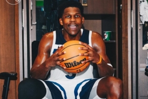 赛后,森林狼官方晒图,爱德华兹拿到本场比赛的用球。