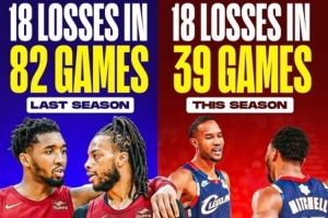赛季前39场,骑士输掉了18场。整个上赛季,球队一共只输了18场。