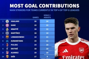 体育资讯1月9日讯 《转会市场》统计了本赛季五大联赛排名前四的球队各自主力中锋的参与进球情况,哈兰德、凯恩、姆巴佩分列前三,戴维、约克雷斯、贡萨洛·拉莫斯列倒数前三。
