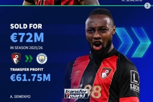 体育资讯1月10日讯 曼城已经官宣签下塞梅尼奥,《转会市场》统计显示这也是伯恩茅斯近年来通过转卖盈利最多的一笔交易(单位:欧元)。
