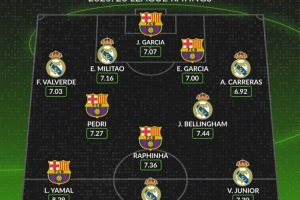 后卫:巴尔韦德(皇马,7.03分)、米利唐(皇马,7.16分)、埃里克·加西亚(巴萨,7.00分)、卡雷拉斯(皇马,6.92分)
