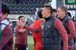 赛后,于大宝(训练员)、黄博文(助教)等人进场庆祝,U23国足全队一起合影,拜合拉木做出姆巴佩式庆祝动作。