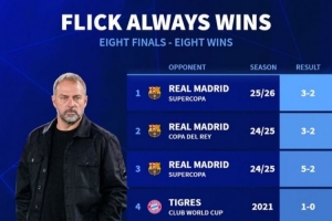 体育资讯1月12日讯 巴萨在本轮西超杯3-2力克皇马,弗里克延续了自己执教决赛必胜的完美战绩。《转会市场》也回顾了这8场比赛的比分。
