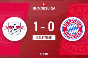 上半场补时4分钟。半场战罢,莱比锡1-0拜仁。