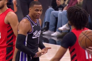 心情不错!德罗赞和威少开拓者主场观战耐克峰会 两人有说有笑