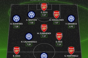 体育资讯1月20日讯 阿森纳将在本轮欧国客战国米,whoscored统计了双方的本赛季欧冠评分合体最佳阵,枪手6人、国米5将。