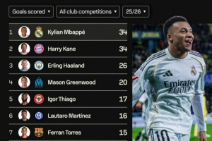 体育资讯1月25日讯 在本轮西甲,皇马2-0击败比利亚雷亚尔,姆巴佩梅开二度。以下为五大联赛球员在本赛季各项赛事总进球榜,姆巴佩与凯恩均打进34球,具体如下: