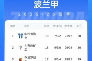 •华沙普洛克遭遇五连平,却从第三升至榜首;