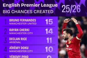 体育资讯1月27日讯 Squawka统计了本赛季球员在英超创造重大机会的次数,并列出榜单,B费15次居首,谢尔基14次第二。